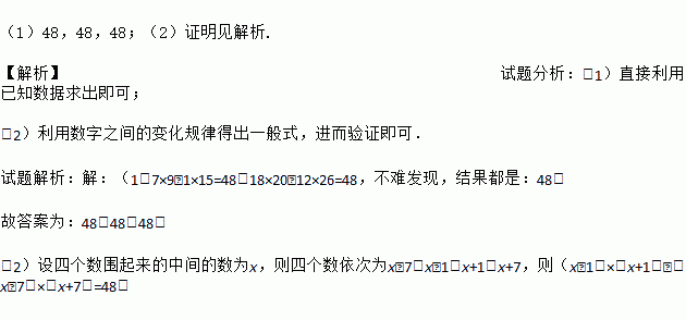 (1)48,48,48;(2)证明见解析. 【解析】试题分析:(1)直接利用已知数据求出即可; (2)利用数字之间的变化规律得出一般式,进而验证即可. 试题解析:【解析】 (1)7×9﹣1×15=48,18×20﹣12×26=48,不难发现,结果都是:48; 故答案为:48,48,48; (2)设四个数围起来的中间的数为x,则四个数依次为x﹣7,x﹣1,x+1,x+...
