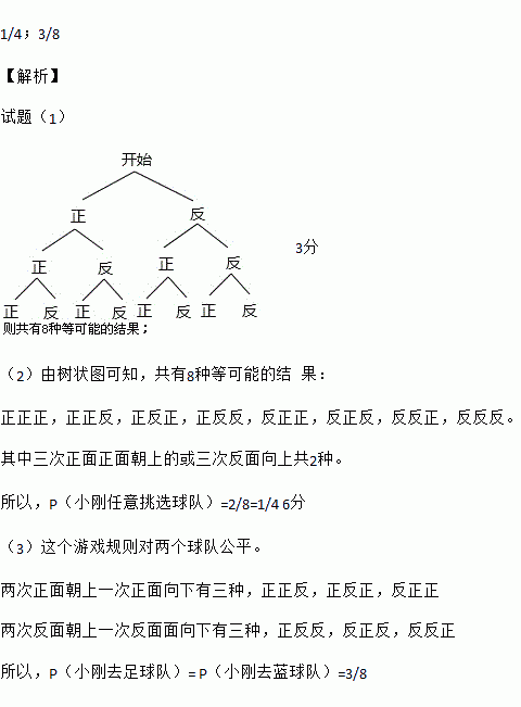 小刚很擅长球类运动,课外活动时,足球队、篮球队都力邀他到自己的阵营,小刚左右为难,最后决定通过掷硬币来确定。游戏规则如下:连续抛掷硬币三次,如果三次正面朝上或三次反面朝上,则由小刚任意挑选两球队;如果两次正面朝上一次正面朝下,则小刚加入足球阵营;如果两次反面朝上一次反面朝下,则小刚加入篮球阵营。