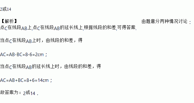 已知线段AB=8 cm,在直线AB上画线段BC,使得BC=6 cm,则线段AC=________cm.