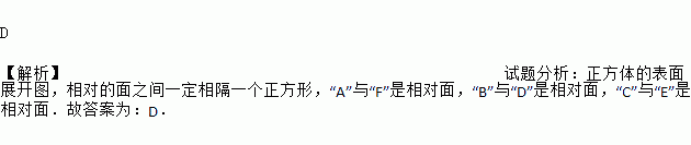 如图为一个表面分别标有:“A”、“B”、“C”、“D”、“E”、“F”六个字母的正方体的平面展开图如图,则与字母“B”所在的面字相对的面上标有字母“_________”.