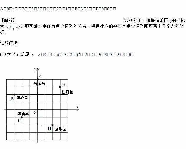 王霞和爸爸、妈妈到人民公园游玩,回到家后,她利用平面直角坐标系画出了公园的景区地图,如图所示.可是她忘记了在图中标出原点和x轴.y轴.只知道游乐园D的坐标为(2,﹣2),请你帮她画出坐标系,并写出其他各景点的坐标.