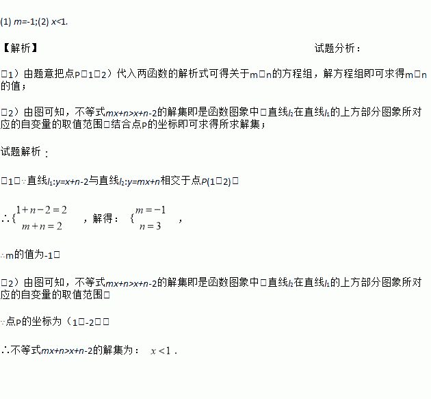 已知直线l1:y=x+n-2与直线l2:y=mx+n相交于点P(1,2).