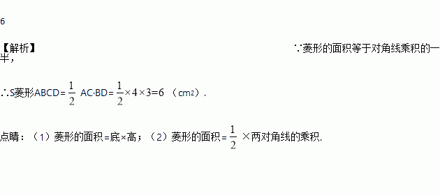在菱形ABCD中,AC=4cm,BD=3cm,则菱形的面积是__________㎝2。