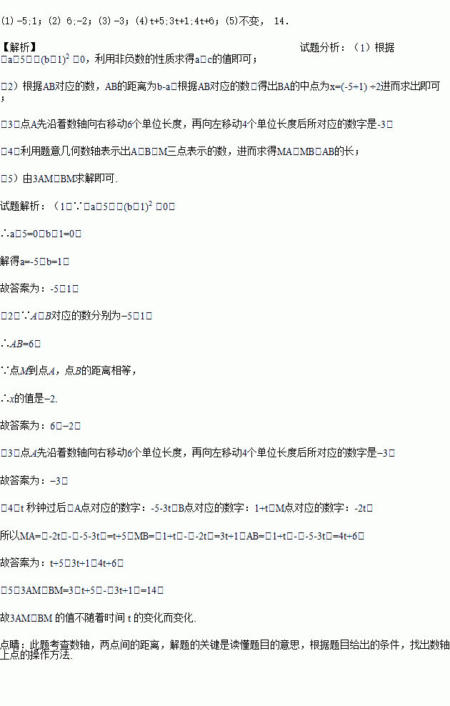 如图:在数轴上 A 点表示数 a,在 B 点表示数 b,O 点表示数 0,点 M 为数轴 上任意一点,对应的数为 x,且 a、b 满足|a+5|+(b-1)2 =0.