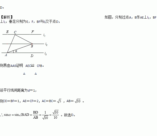 如图,已知l1∥l2∥l3,相邻两条平行直线间的距离相等,若等腰直角△ABC的三个项点分别在这三条平行直线上,则sinα的值是