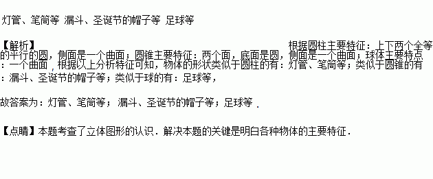 物体的形状类似于圆柱的有________________;类似于圆锥的有______________;类似于球的有_________________.