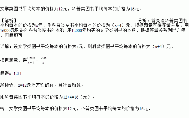 我校为了创建“书香校园”,购买了一批图书,其中科普类图书平均每本的 价格比文学类图书平均每本的价格多4元,已知学校用16000元购买的科普类图书的本数与用12000元购买的文学类图书的本数相等.求学校购买的科普类图书和文学类图书平均每本的价格各是多少元?