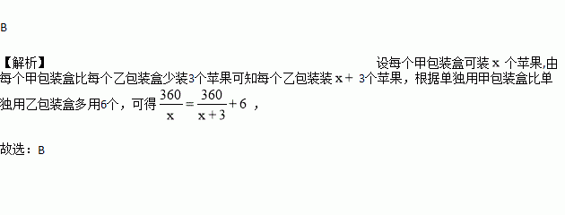 某水果店有甲、乙两种苹果包装盒,现有360个苹果要用这两种包装盒进行包装,已知每个甲包装盒比每个乙包装盒少装3个苹果,单独用甲包装盒比单独用乙包装盒多用6个,设每个甲包装盒可装