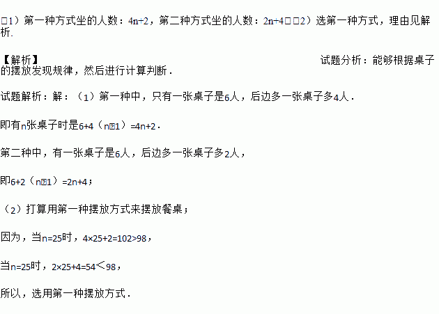 (2)一天中午餐厅要接待98位顾客共同就餐,但餐厅只有25张这样的餐桌,若你是这个餐厅的经理,你打算选择哪种方式来摆放餐桌?为什么?