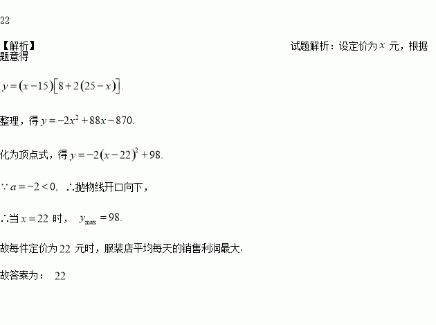 某服装店购进单价为15元的童装若干件,销售一段时间后发现:当销售价为25元时平均每天能售出8件,而当销售价每降低1元,平均每天能多售出2件.当每件的定价为_______元时,该服装店平均每天的销售利润最大.