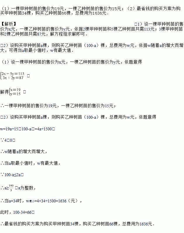 (2)学校准备购进这两种树苗共100棵,并且乙种树苗的数量不多于甲种树苗数量的2倍,请设计出最省钱的购买方案,并求出此时的总费用.