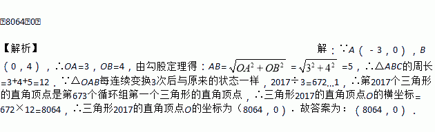 如图,平面直角坐标系中,A(﹣3,0)B(0,4)把△AOB按如图标记的方式连续做旋转变换,这样得到的第2017个三角形中,O点的对应点的坐标为_____.