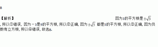 B 【解析】因为3的平方根是,所以①错误, 因为-3是9的平方根,所以②正确,因为都是5的平方根,所以③正确,因为负数有立方根,所以④错误,故选B.