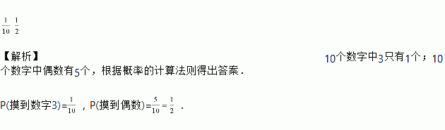 10张卡片分别写有0至9十个数字,将它们放入纸箱后,任意摸出一张,则P(摸到数字3)=________,P(摸到偶数)=________ .