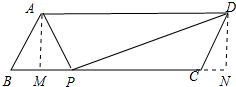1.在平行四边形ABCD中,∠ABC=60°,AB=2$\sqrt{3}$,AD=10,点P在直线BC上,且满足∠APD=90°,则∠APB的正切值为$\frac{1}{3}$或3.分析 作AM⊥BC于M,DN⊥BC于N,则∠AMP=∠DNP=90°,MN=AD=10,AM=DN,由平行四边形的性质和三角函数求出DN=AM=AB•sin60°=3,证明△PDN∽△APM,得出对应边成比例求出DN,即可得出结果.