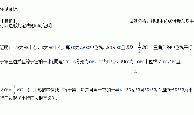 如图,△ABC中,中线BD、CE相交于O,F、G分别为OB、OC的中点。求证:四边形DEFG为平行四边形。