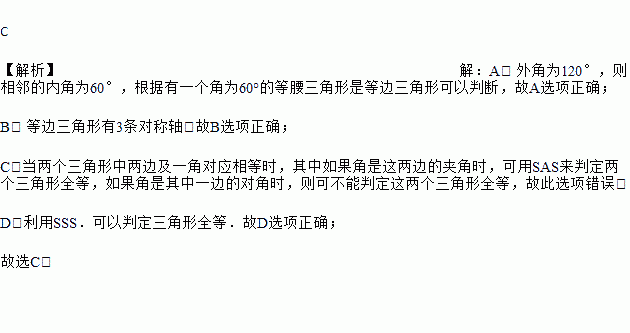 C ¡¾½âÎö¡¿¡¾½âÎö¡¿ A£® Íâ½ÇΪ120¡ã£¬ÔòÏàÁÚµÄÄÚ½ÇΪ60¡ã£¬¸ù¾ÝÓÐÒ»¸ö½ÇΪ60¡ãµÄµÈÑüÈý½ÇÐÎÊǵȱßÈý½ÇÐοÉÒÔÅжϣ¬¹ÊAÑ¡ÏîÕýÈ·£» B£® µÈ±ßÈý½ÇÐÎÓÐ3Ìõ¶Ô³ÆÖᣬ¹ÊBÑ¡ÏîÕýÈ·£» C£®µ±Á½¸öÈý½ÇÐÎÖÐÁ½±ß¼°Ò»½Ç¶ÔÓ¦ÏàµÈʱ£¬ÆäÖÐÈç¹û½ÇÊÇÕâÁ½±ßµÄ¼Ð½Çʱ£¬¿ÉÓÃSASÀ´Åж¨Á½¸öÈý½ÇÐÎÈ«µÈ£¬Èç¹û½ÇÊÇÆäÖÐÒ»±ßµÄ¶Ô½Çʱ£¬Ôò¿É²»ÄÜÅж¨ÕâÁ½¸öÈý½ÇÐÎÈ«µÈ£¬¹Ê´ËÑ¡Ïî´íÎó£» D£®ÀûÓÃSSS£®¿ÉÒÔ...