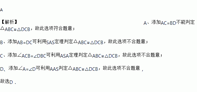 A 【解析】A、添加AC=BD不能判定△ABC≌△DCB,故此选项符合题意; B、添加AB=DC可利用SAS定理判定△ABC≌△DCB,故此选项不合题意; C、添加∠ACB=∠DBC可利用ASA定理判定△ABC≌△DCB,故此选项不合题意; D、添加∠A=∠D可利用AAS判定△ABC≌△DCB,故此选项不合题意, 故选D.