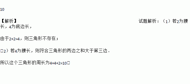 10 【解析】试题解析:(1)若2为腰长,4为底边长, 由于2+2=4,则三角形不存在; (2)若4为腰长,则符合三角形的两边之和大于第三边. 所以这个三角形的周长为4+4+2=10.