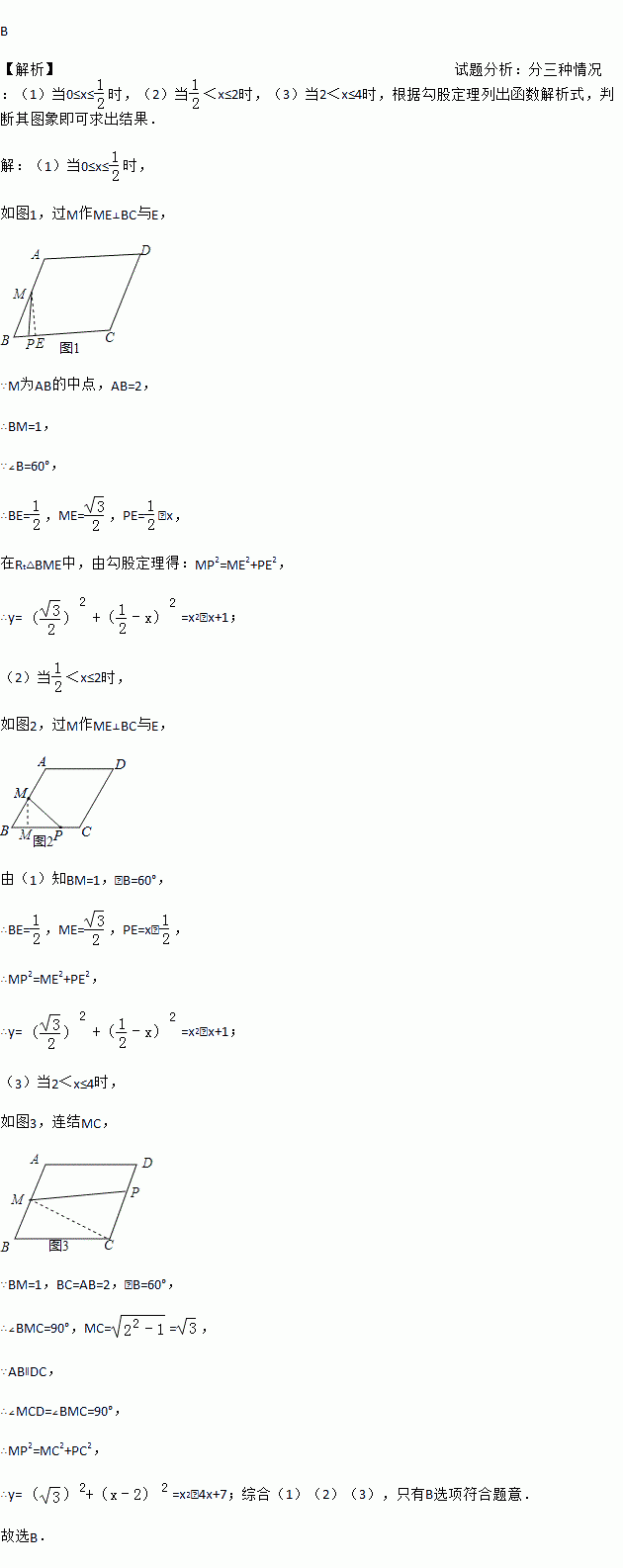 如图,菱形ABCD中,AB=2,∠B=60°,M为AB的中点.动点P在菱形的边上从点B出发,沿B→C→D的方向运动,到达点D时停止.连接MP,设点P运动的路程为x,MP 2=y,则表示y与x的函数关系的图象大致为( )