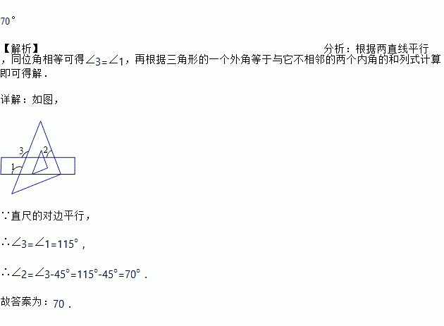 如图,把一块等腰直角三角形的三角板的直角顶点放在直尺的一边上,如果∠1=115°,那么∠2是______度.