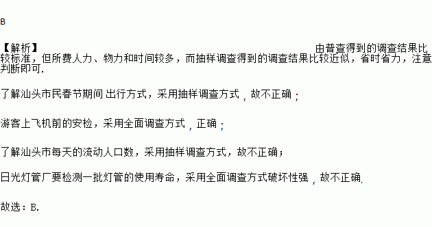 A. 了解汕头市民春节期间 出行方式,采用全面调查方式