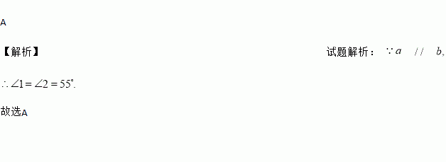 如图,直线a//b,∠1=55°,则∠2等于 ( )