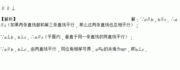 已知直线a、b、c,若a∥b,b∥c,则a_____c,若a⊥b,b⊥c,则a_____c,若a∥b,b⊥c,则a______c。