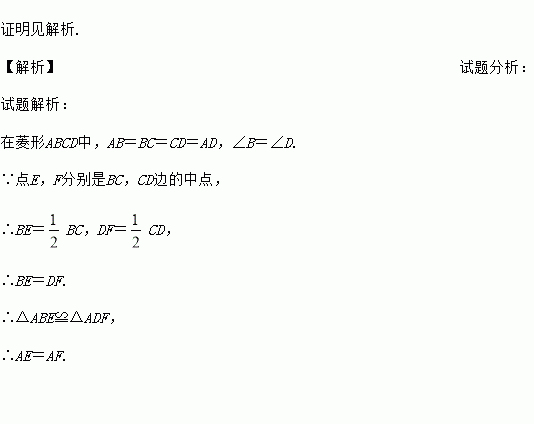 如图,菱形ABCD中,点E,F分别是BC,CD边的中点.求证:AE=AF.