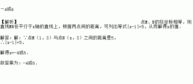 .在平面直角坐标系中,若点M(1,3)与点N(x,3)之间的距离是5,则x的值是____________.
