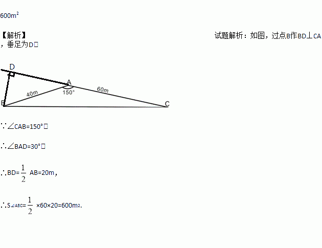如图,是一块三角形空地,已知AB=40m,AC=60m,∠BAC=150°,这块三角形空地面积是___ .