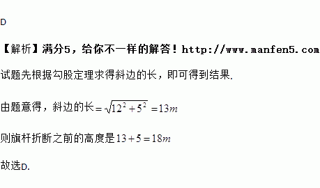 如图,一根垂直于地面的旗杆在离地面5m处撕裂折断,旗杆顶部落在离旗杆底部12m处,旗杆折断之前的高度是( )