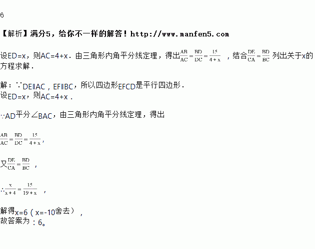 如图,在△ABC中,AD平分∠BAC,DE∥AC,EF∥BC,若AB=15,AF=4,则DE=_____.