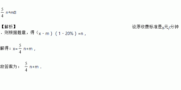 n+m. 【解析】设原收费标准是x元/分钟.则根据题意,得(x﹣m)(1﹣20%)=n, 解得:x=n+m, 故答案为: n+m.