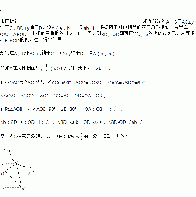 如图,直角三角形AOB中,O为坐标原点,∠AOB=90°,∠B=30°,若点A在反比例函数y= (x>0)图像上运动,那么点B必在函数( )的图像上运动.