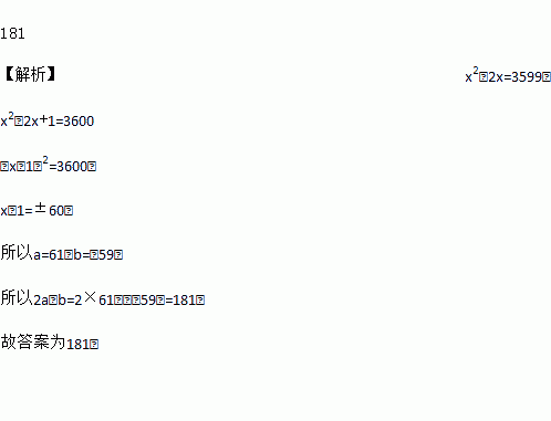 181 【解析】x2﹣2x=3599, x2﹣2x+1=3600 (x﹣1)2=3600, x﹣1=±60, 所以a=61,b=﹣59, 所以2a﹣b=2×61﹣(﹣59)=181. 故答案为181.