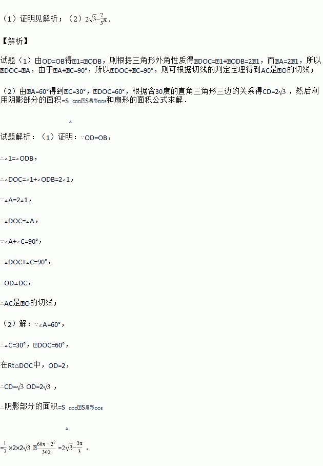 (2)若∠A=60°,⊙O的半径为2,求阴影部分的面积.(结果保留根号和π)