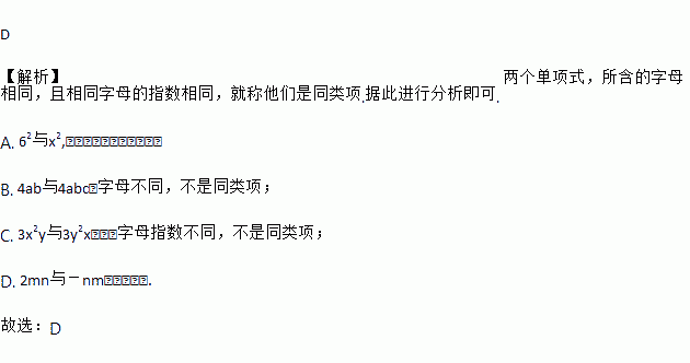 A. 62与x2 B. 4ab与4abc C. 3x2y与3y2x D. 2mn与-nm