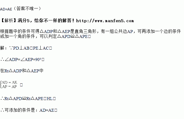 如图,PD⊥AB,PE⊥AC,垂足分别为D、E,用HL证明△APD≌△APE需添加的条件是_______,(填一个即可)