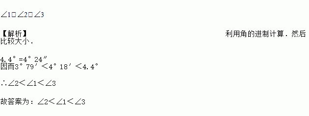 如果∠1=4°18′,∠2=3°79′,∠3=4.4°,那么∠1,∠2,∠3的大小顺序是________________.(用“<”连接)