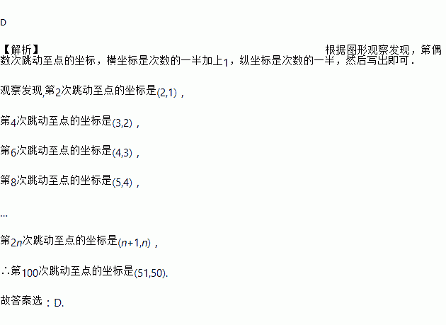 如图,在平面直角坐标系上有点A(1.O),点A第一次跳动至点A1(-1,1).第四次向右跳动5个单位至点A4(3,2),…,依此规律跳动下去,点A第100次跳动至点A100的坐标是( )