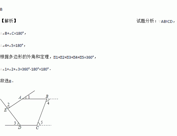 如图,五边形ABCDE中,AB∥CD,∠1、∠2、∠3分别是∠BAE、∠AED、∠EDC的外角,则∠1+∠2+∠3等于( )