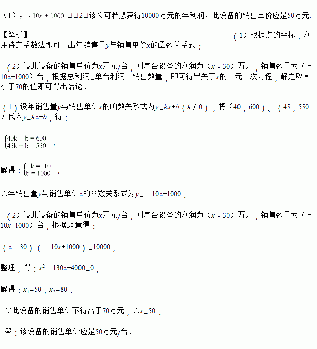 (2)根据相关规定,此设备的销售单价不得高于70万元,如果该公司想获得10000万元的年利润.则该设备的销售单价应是多少万元?