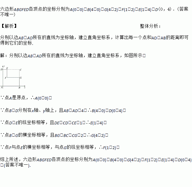 如图,四边形ABCD是边长为4的正方形,在正方形的一个角上剪去长方形CEFG,其中E,G分别是边CD,BC上的点,且CE=3,CG=2,剩余部分是六边形ABGFED,请你建立适当的直角坐标系求六边形ABGFED各顶点的坐标.