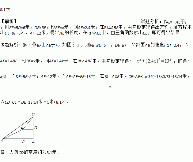 某数学兴趣小组同学进行测量大树CD高度的综合实践活动,如图,在点A处测得直立于地面的大树顶端C的仰角为36°,然后沿在同一剖面的斜坡AB行走13米至坡顶B处,然后再沿水平方向行走6米至大树脚底点D处,斜面AB的坡度(或坡比)i=1:2.4,求大树CD的高度?(参考数据:sin36°≈0.59,cos36°≈0.81,tan36°≈0.73)
