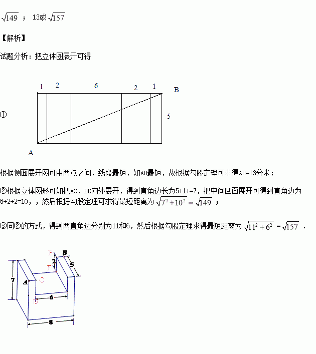 在一个长为8分米,宽为5分米,高为7分米的长方体上,截去一个长为6分米,宽为5分米,深为2分米的长方体后,得到一个如图所示的几何体.一只蚂蚁要从该几何体的顶点A处,沿着几何体的表面到几何体上和A相对的顶点B处吃食物,那么它需要爬行的最短路径的长是 分米.