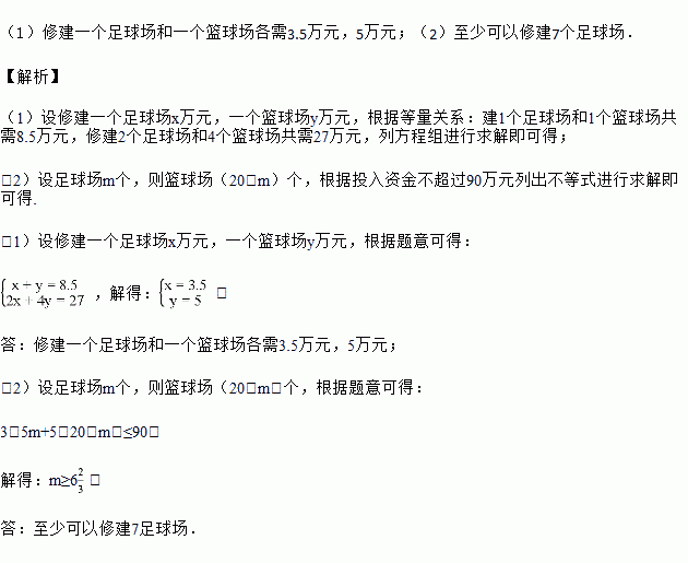 (2)该企业预计修建这样的足球场和篮球场共20个,投入资金不超过90万元,求至少可以修建多少个足球场?