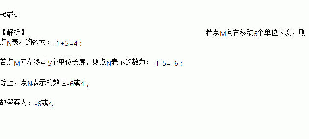 点M表示的有理数是-1,点M在数轴上移动5个单位长度后得到点N,则点N表示的有理数是________.