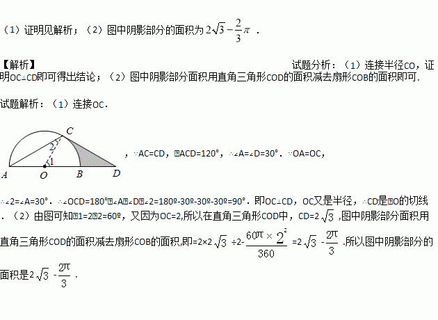 如图,点D在⊙O的直径AB的延长线上,点C在⊙O上,AC=CD,∠ACD=120°.