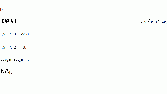 D 【解析】∵x(x+3)=x, ∴x(x+3)-x=0, ∴x(x+2)=0, ∴x1=0或x2=﹣2 故选D.